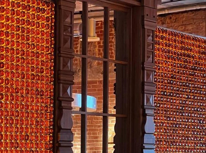 По дизайну. Мы заметили, что внутри сделано много отсылок к прошлому пивзавода — в стене имеются наличники из особняка Суркова. В зале красуется стена из пивных бутылок — дело в том, что раньше именно здесь располагался склад для хранения пива. Варили пенное, к слову, в соседнем корпусе.